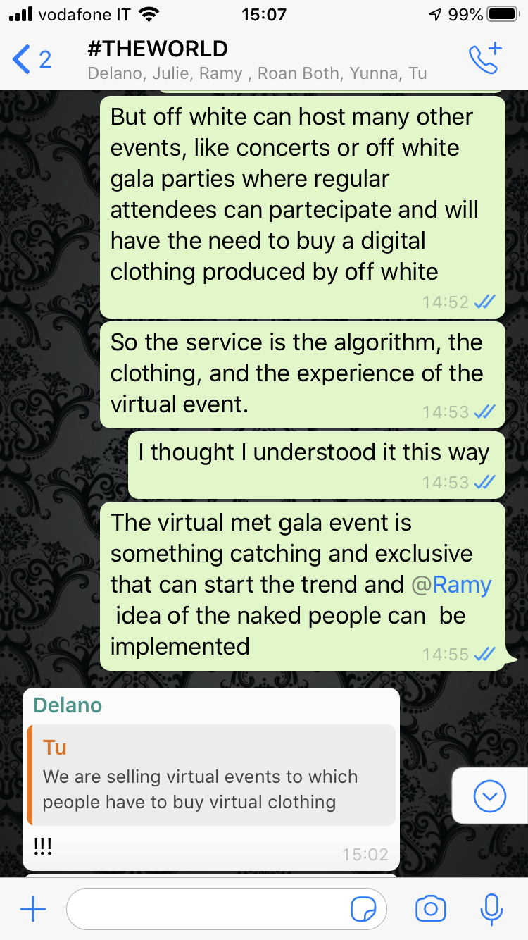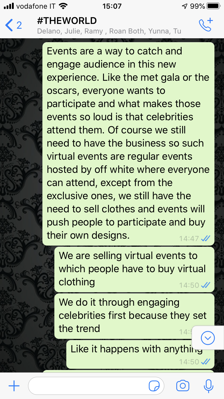 The answer was experiences. Therefore we had to sell virtual experiences in order to create the need for digital clothing. The natural evolution was events. Annual events (like the MET gala or the Oscars) that inevitably occur in the real world could be hosted in a VR platform. This would create the need for attendees to buy clothing.